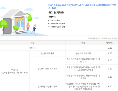 우리은행 신규 고객과 CMA 노트 고객, 마케팅 수신동의 고객에게만 특별 우대금리를 제공하는 적금 상품이다. 기본금리 2%에 당사 최초 거래고객은 4%의 우대금리를 제공하고, CMA 계좌에 일정 금액 이상 잔고를 유지하면 최대 3%, 마케팅 수신동의 시 1%를 더해 최고 10%의 이자가 완성되는 것이다. 적금 가입 기간은 12개월 단기이고, 월 10만 원까지만 납입할 수 있다.