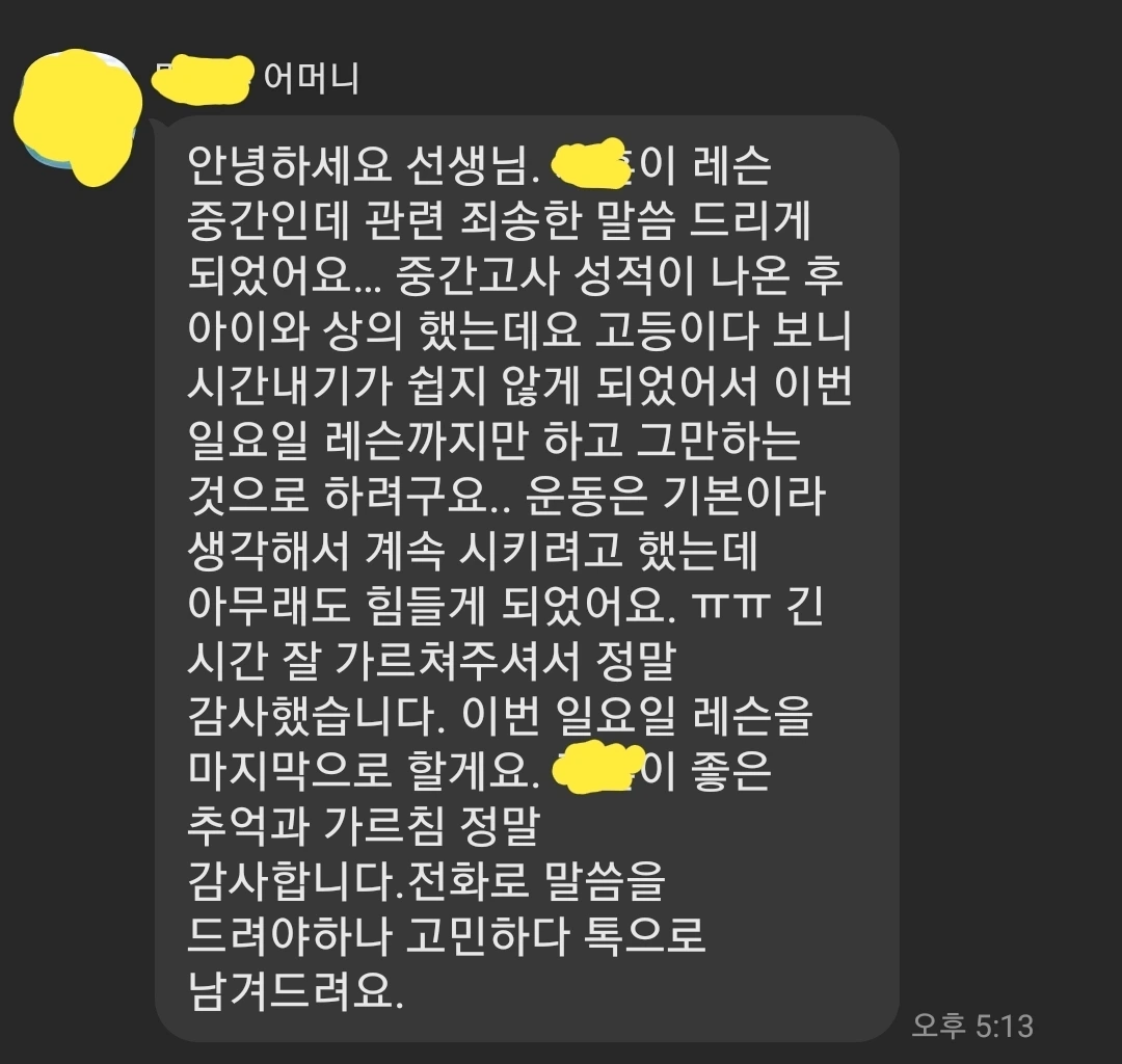 고등학생이 되어 학원을 여러 개 다니고, 학업의 중요성 때문에 레슨을 하기 힘들다고 하셨습니다.