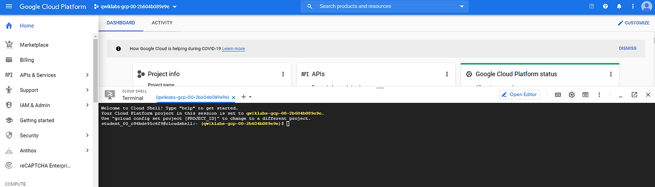 화면 오른쪽 위에 Cloud shell 클릭 실행한다. 편지봉투 모양의 아이콘 이다.
