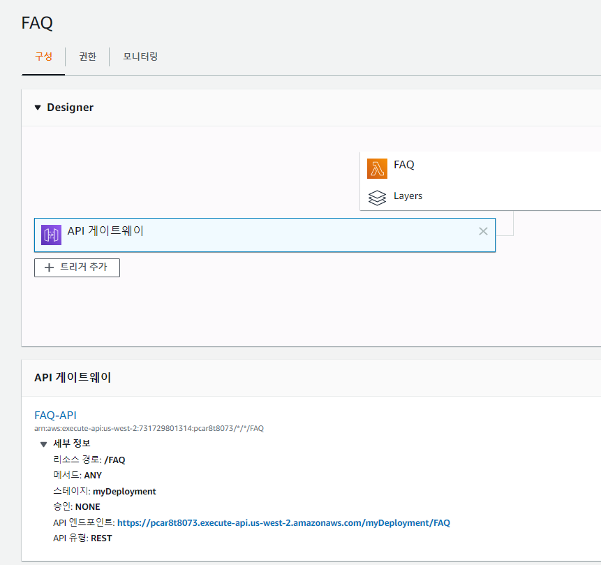 API Gateway Endpoint 가 있다. 클릭 > URL 접속