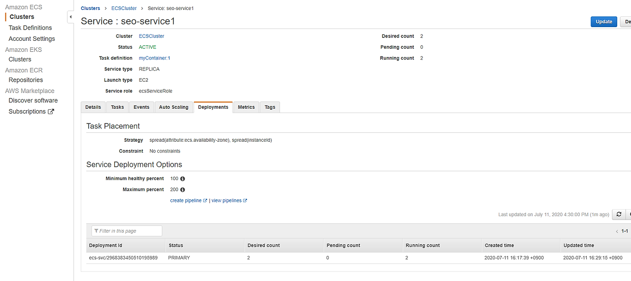 ECSCluster > myservice 체크 > 업데이트 > Revision 을 latest로 변경하자!!
