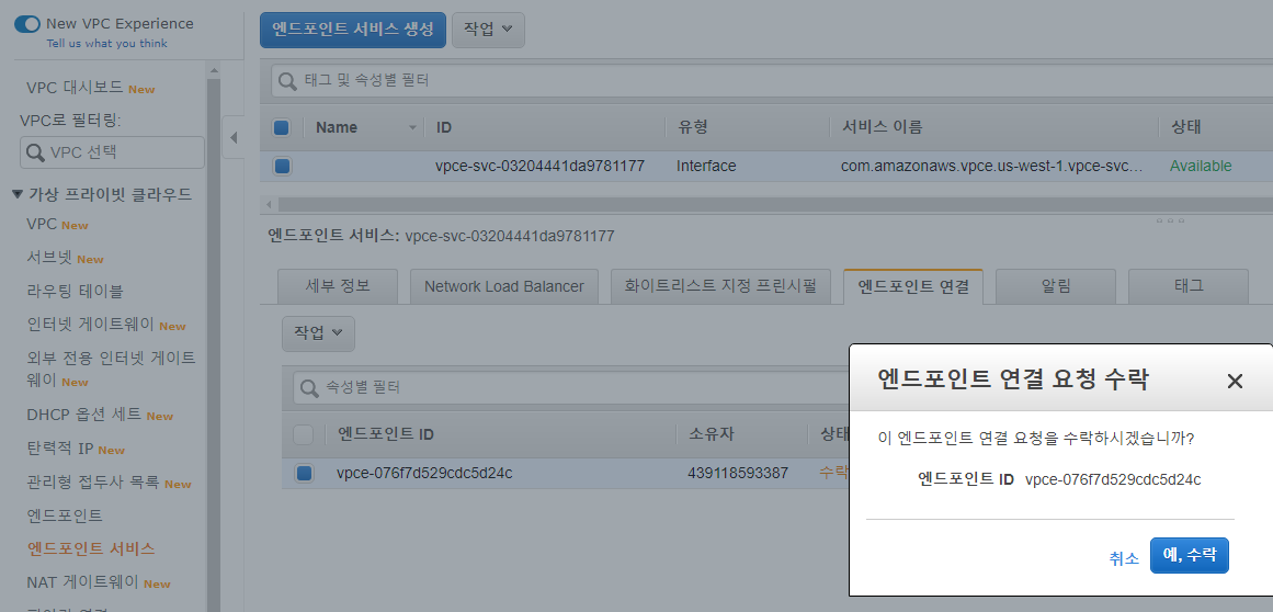 C accout > VPC > Endpoint service > endpoint Connectins > Action > 수락