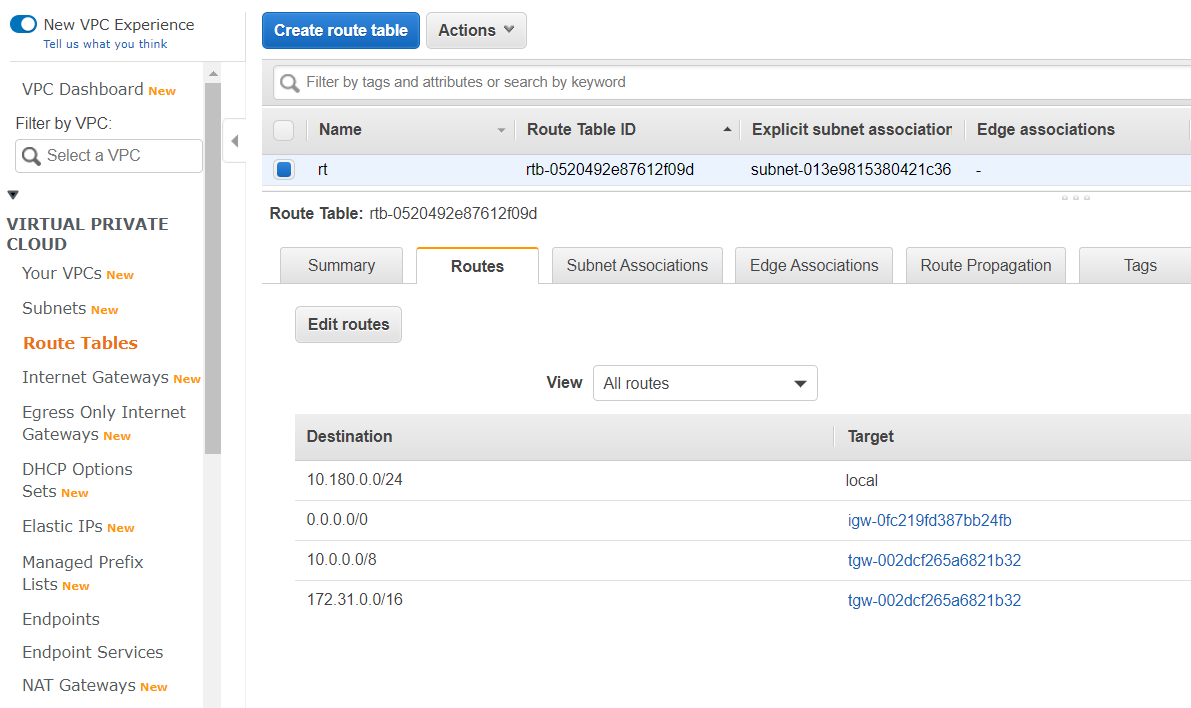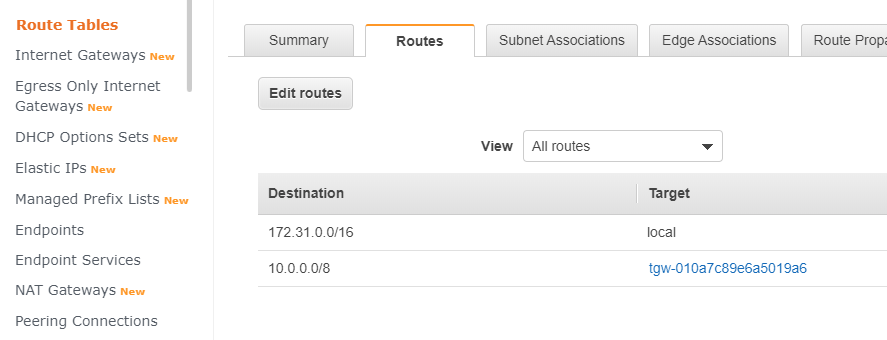 10.0.0.0/8에 대해 TGW로 던져 준다.