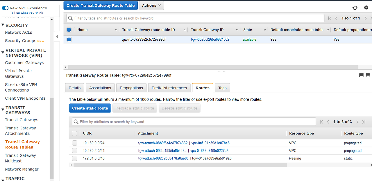 Transit Gateway Route Table 을 잡아 줘야 한다.