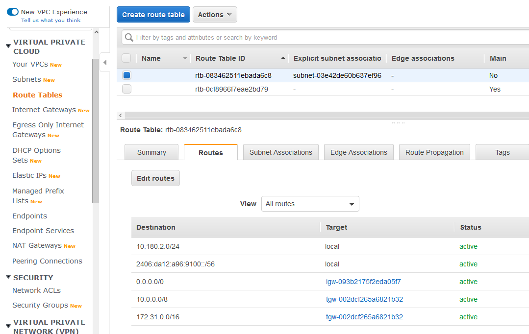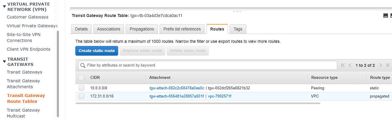 TGW간 Peering을 맺기 때문에 VPC에 Route tables는 TGW로만 던져주면 된다.