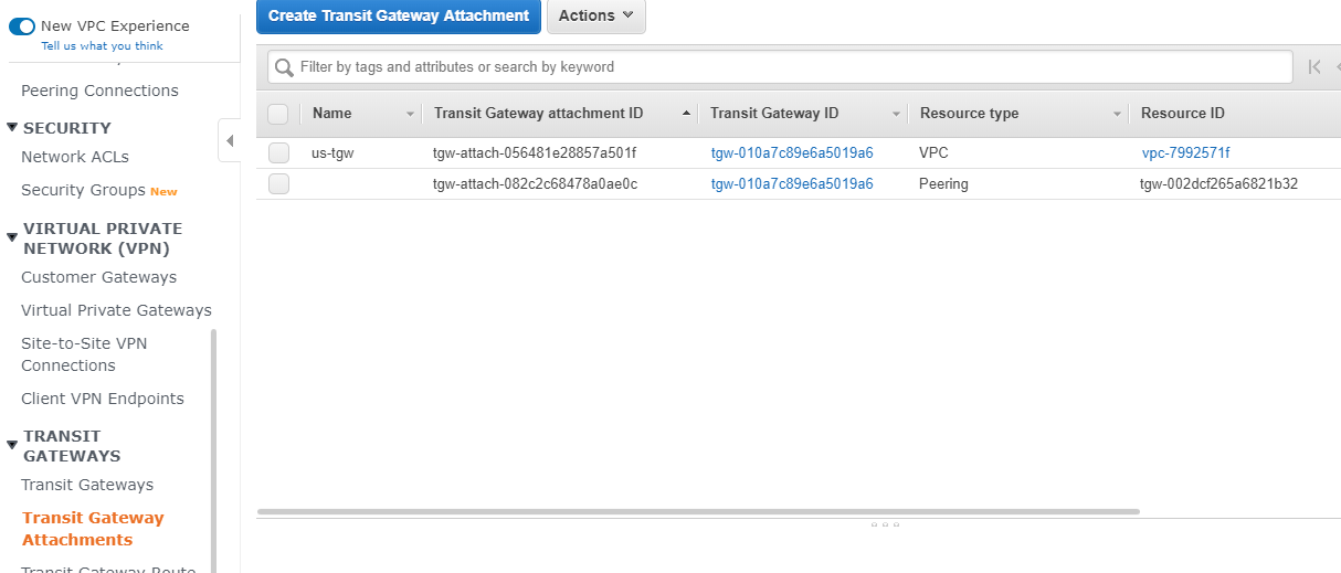 TGW간 연결은 Attachement 의 피어링 연결기능으로 한다.