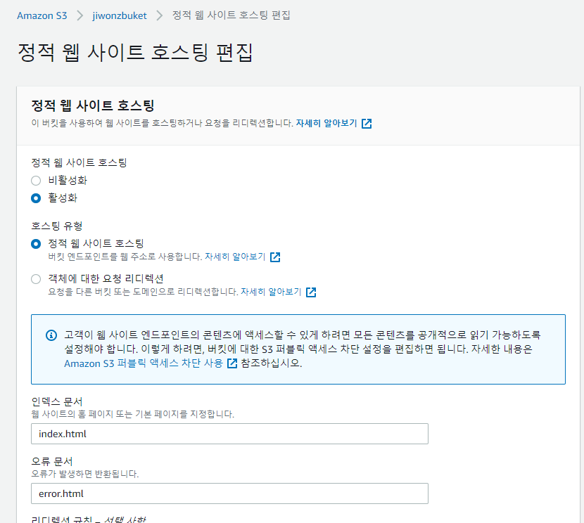 S3가 웹서버가 되는 건은 호스팅 활성화 설정을 하는 것이 apache 설치하는 것과 동일한 기능을 한다고 설명해 주었다.