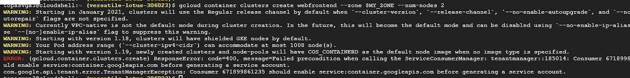 gcloud container clusters create webfrontend --zone $MY_ZONE --num-nodes 2