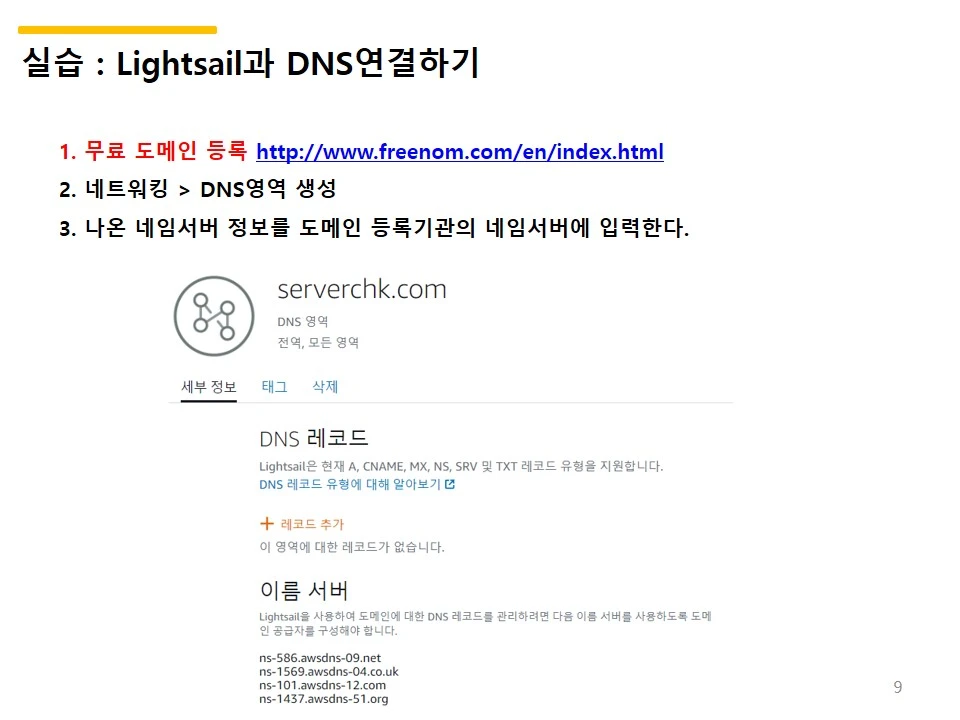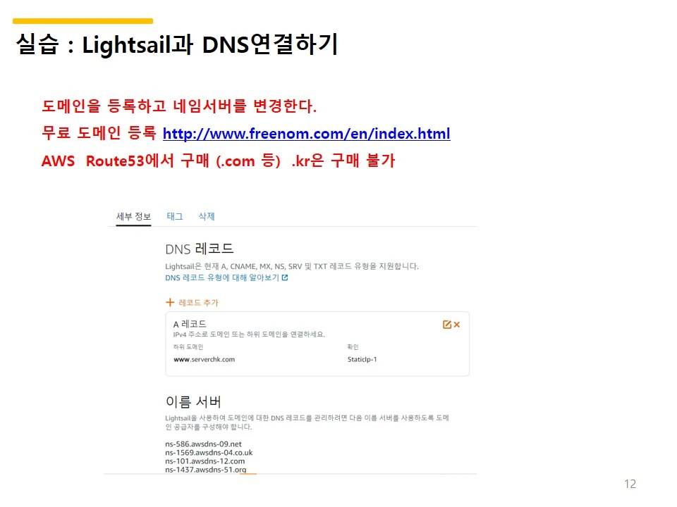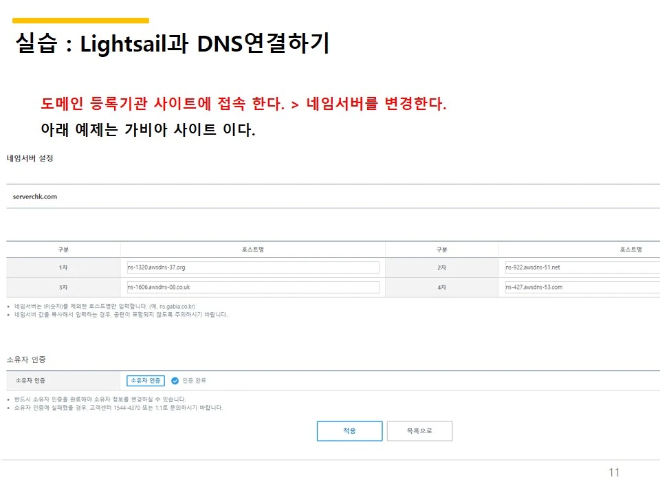 AWS Lightsail 에서 나온 네임서버 이름으로 입력한 결과를 밴드에 캡처 해서 올리라고 했다.