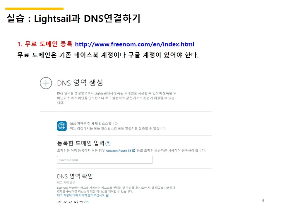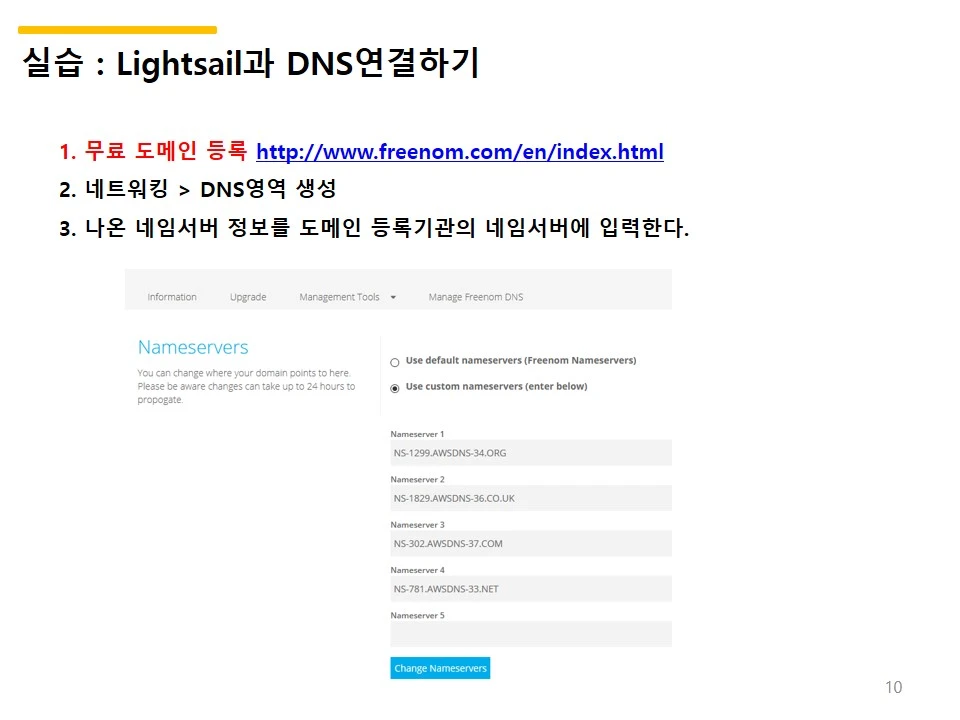 실습 결과로 무료 도메인 사이트에서 구매한 도메인의 네임서버를 정보를 올리라고 한다.