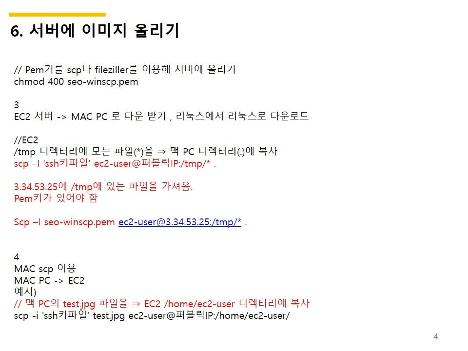 scp -i 'ssh키파일' test.jpg ec2-user@퍼블릭IP:/home/ec2-user/