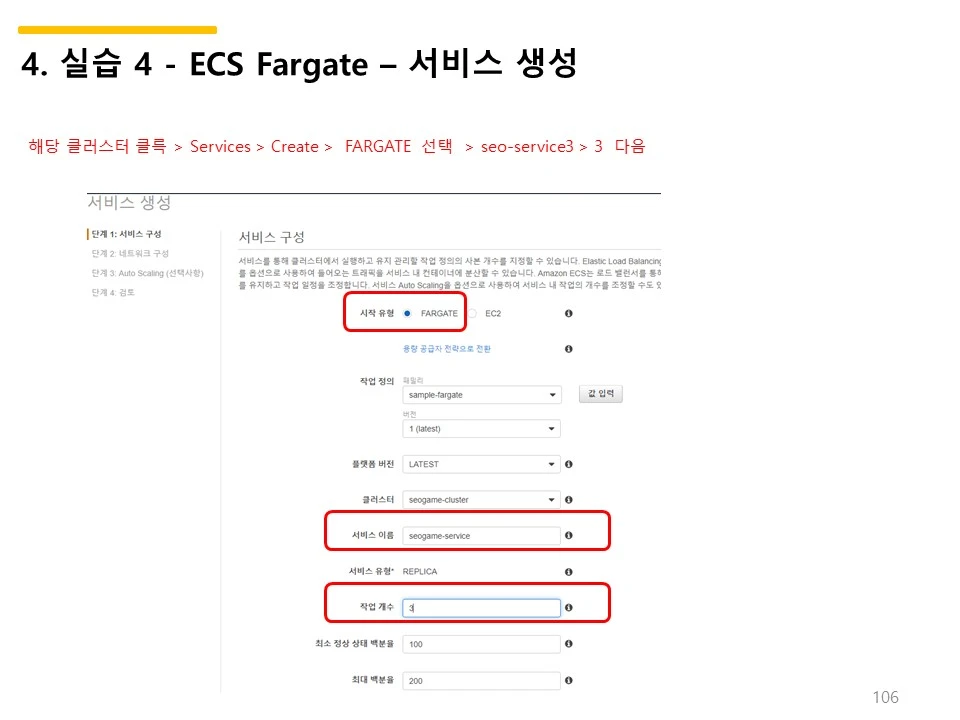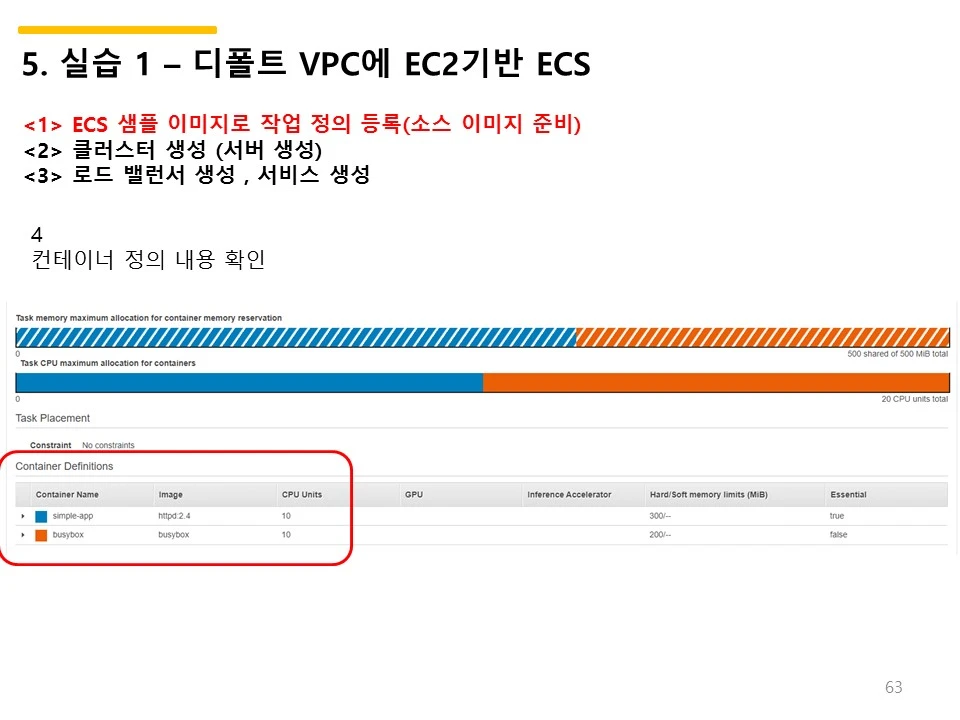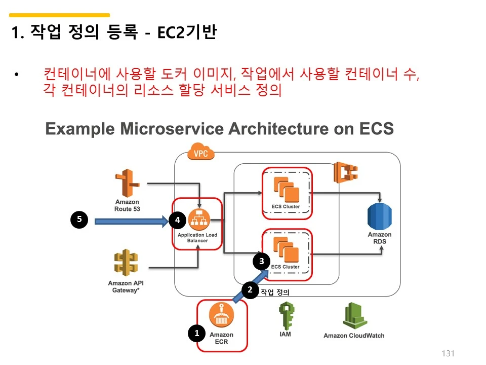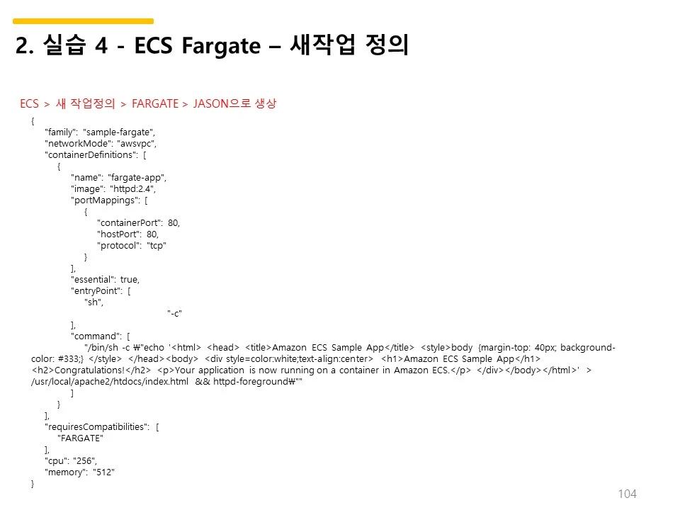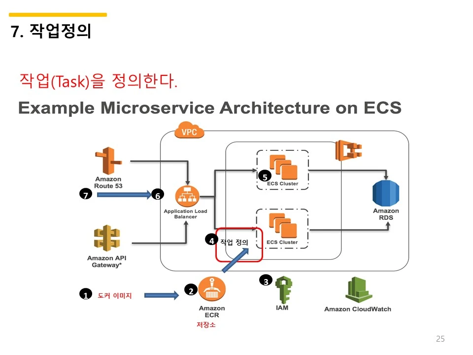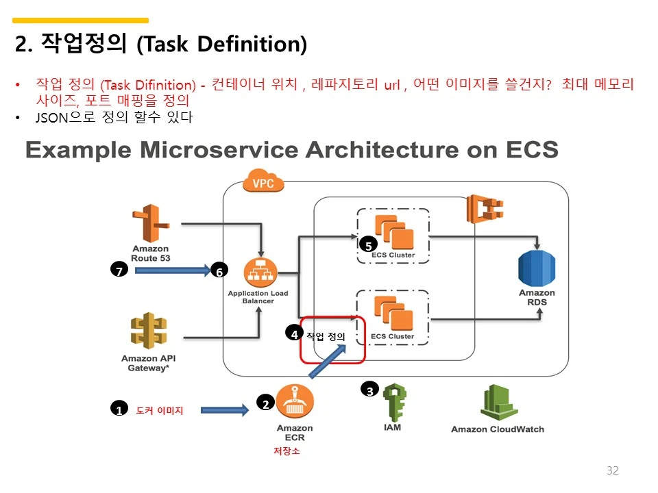 어떤 작업을 할지 정한다. Task , 웹서비스, DB서비스 등 정함. 컨테이너 용량 정함