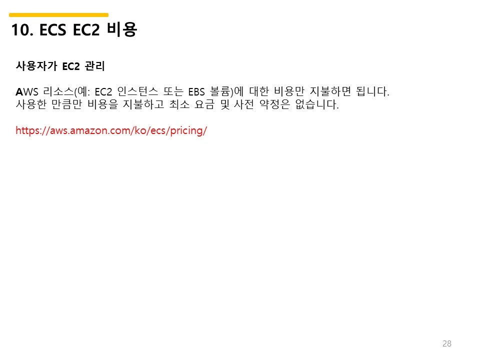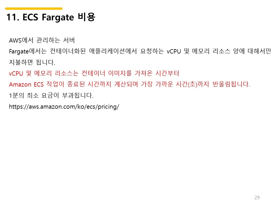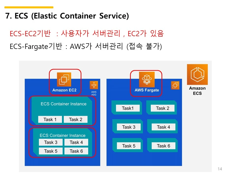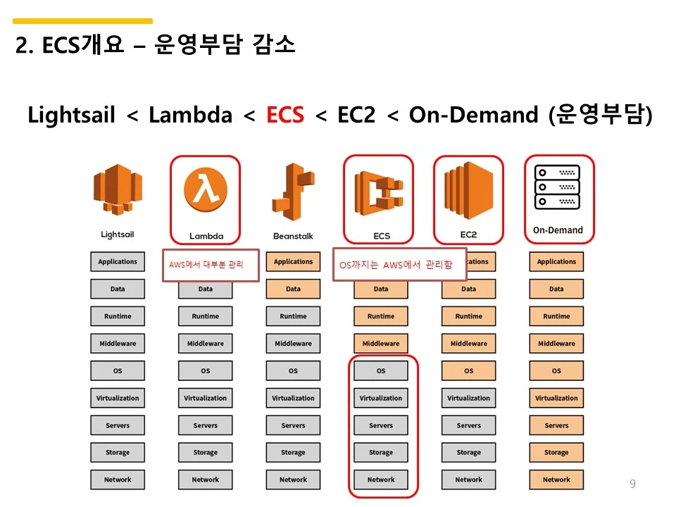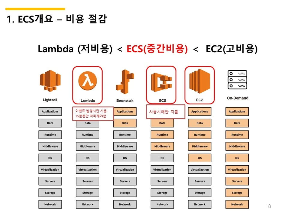 ECS - OS까지는 AWS에서 관리해준다. 우리는 미들웨어나 애플리케이션만 관리하면 된다.