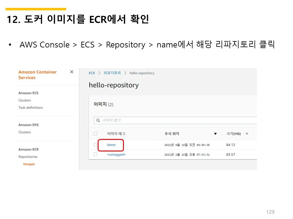 저장소/ECR/리파지토리의 이미지를 가져온다.