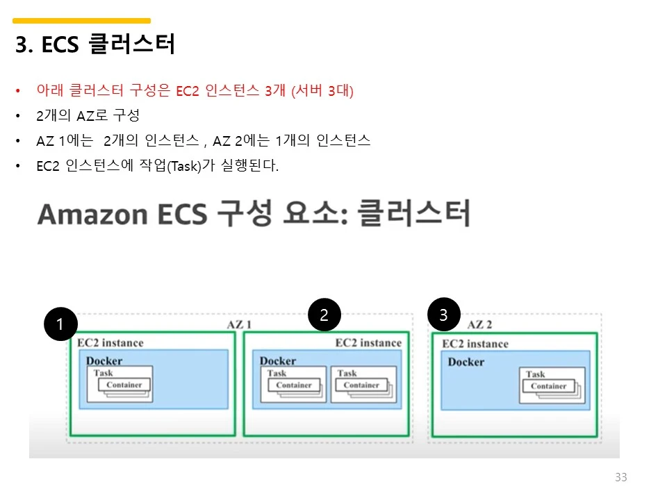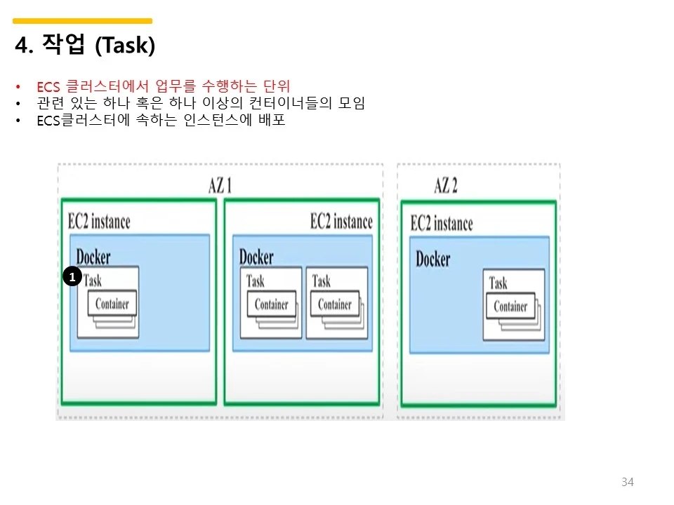 클라스터 = 호스트 서버, 2곳 이상의 AZ /IDC에 구축 = Task가 실행된다. = Task 안에는 컨테이너가 돌아감