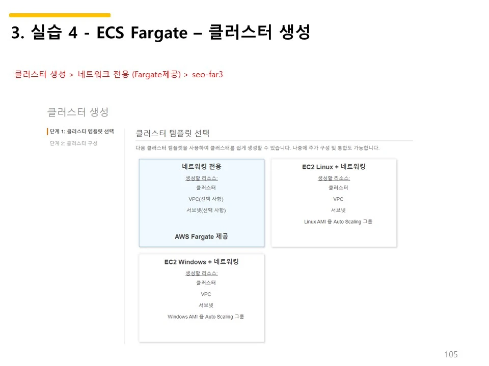ECS Cluster를 생성한다. 호스트 서버, 작업자 서버를 생성하는 것이다.