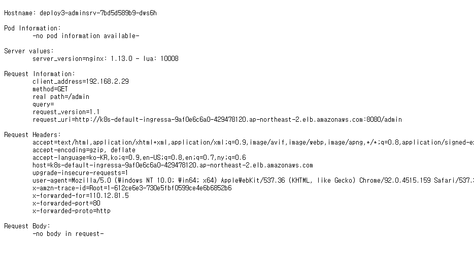 (t6-admin@myeks:default) [root@myeks-host ~]# echo http://$(kubectl get ingress/ingress-alb -o jsonpath='{.status.loadBalancer.ingress[*].hostname}')/admin