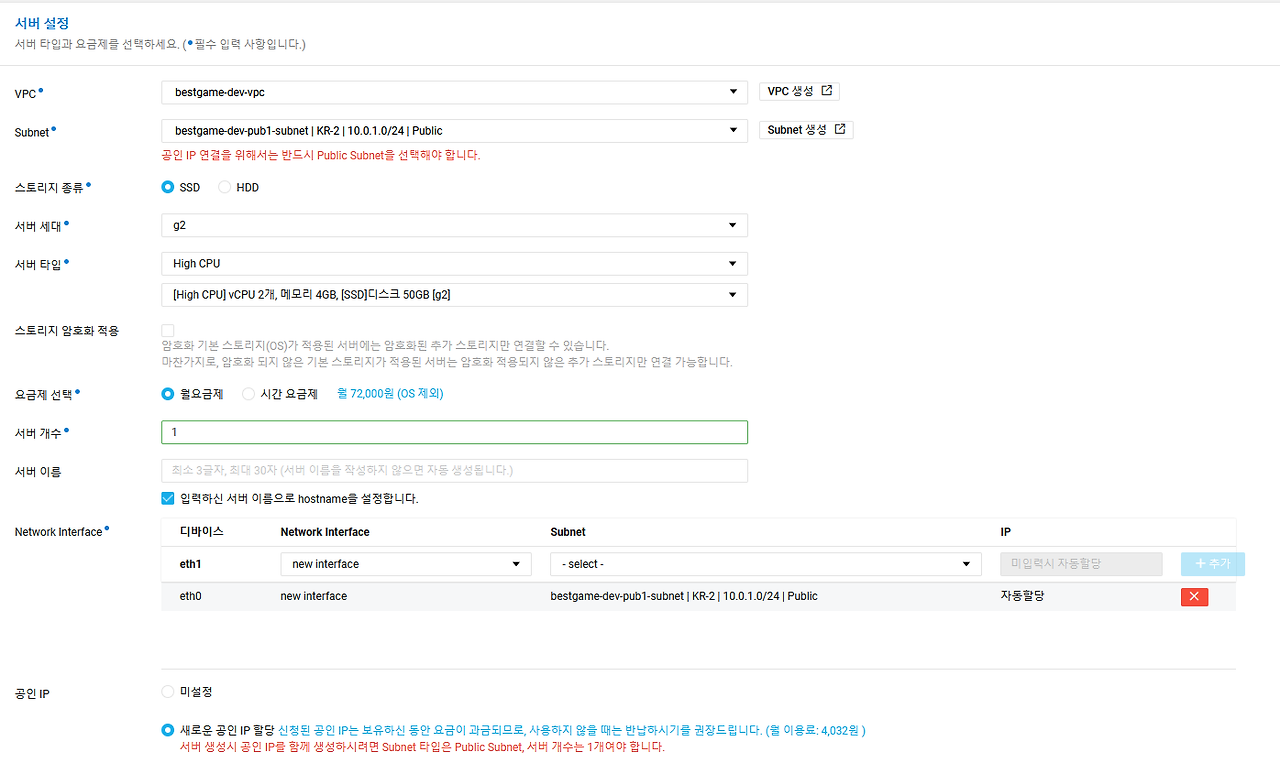 새로운 공인IP 할당으로 변경한다.