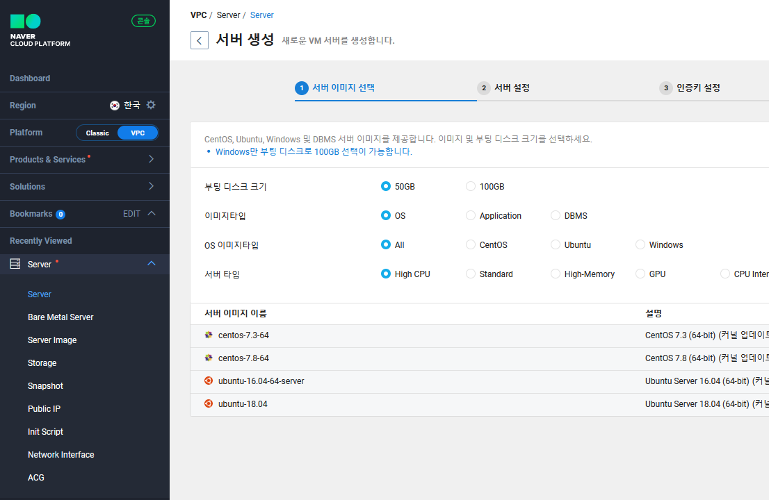 왼쪽 Products & Services 에서 오른쪽 위 VPC 클릭