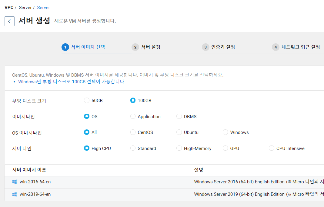 100GB로 선택해야 Windows 이미지를 선택할 수 있다.