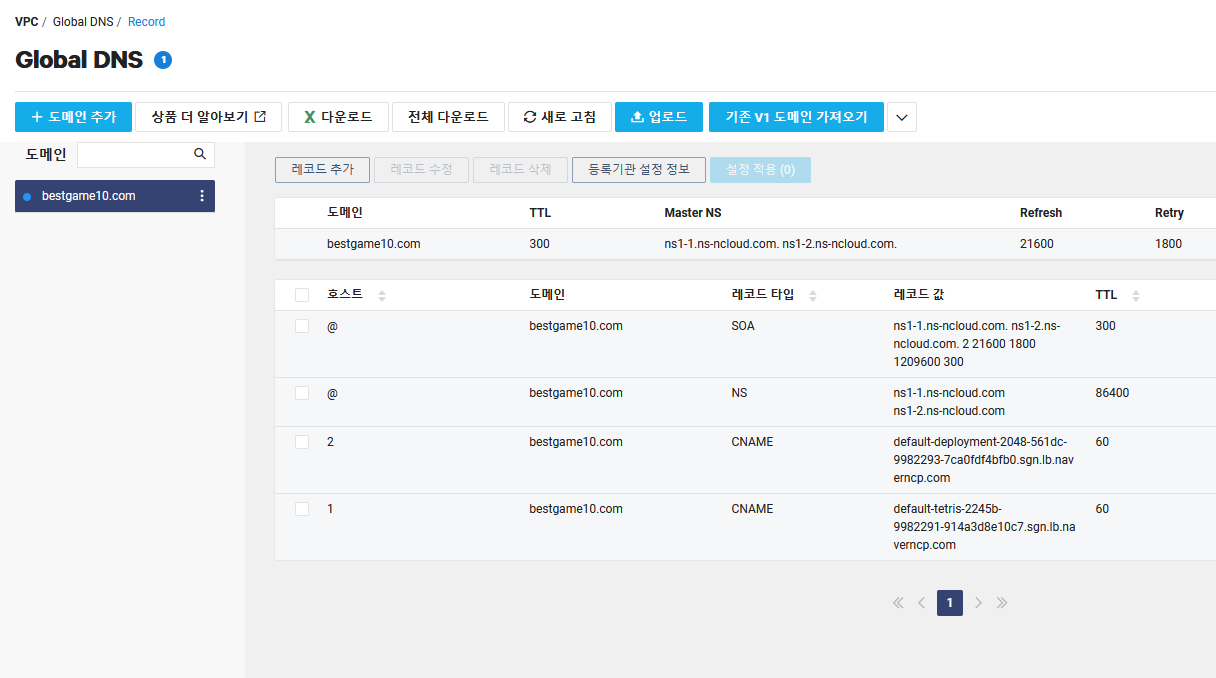 service/tetris LoadBalancer 198.19.157.108 default-tetris-075d3-10251611-43faf1d23789.kr.lb.naverncp.com 80:30714/TCP 67s app=tetris