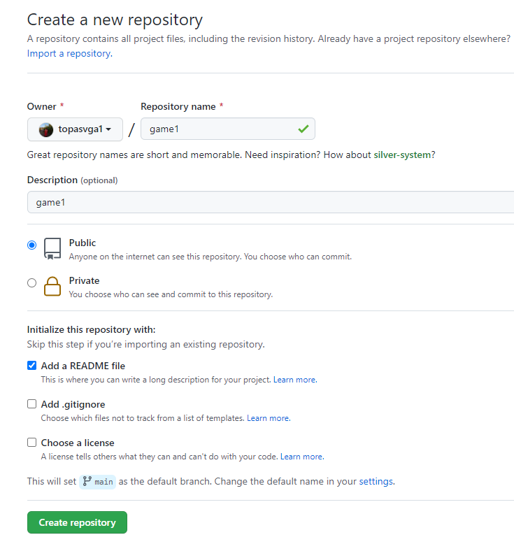 오른쪽위 + 표시 > New repository > 레파지 토리 이름 입력