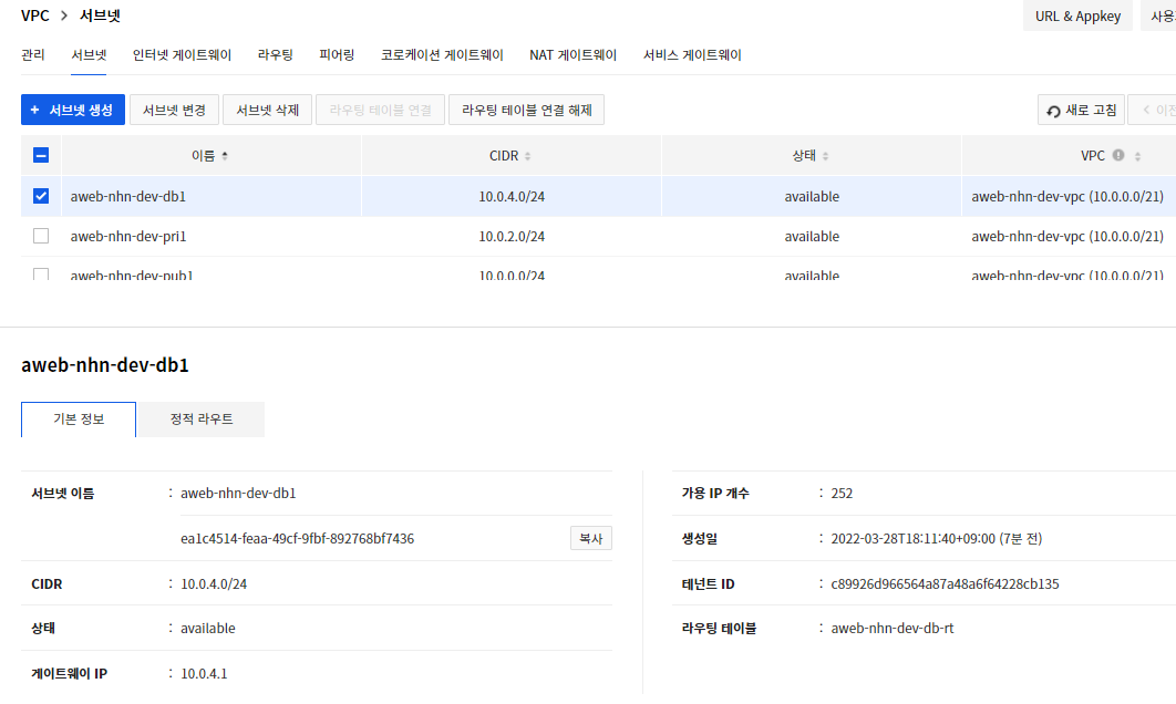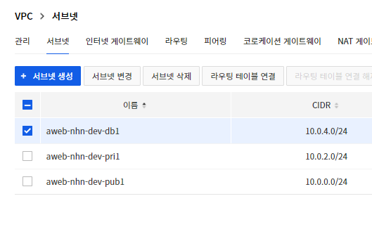 VPC > 서브넷 > aweb-nhn-dev-db1 선택 > 라우팅 테이블 연결