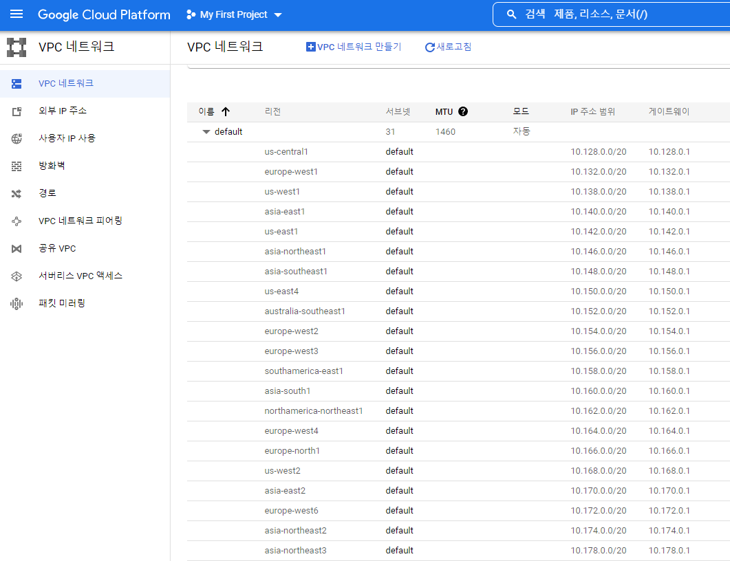 asia-northeast3(서울)에 VM 인스턴스 만들면 해당 10.178.0.0/20 블럭에서 자동 할당 된다.