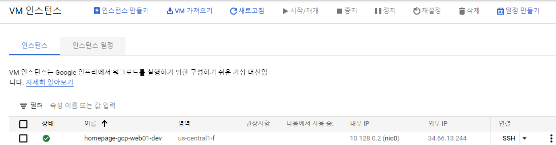 Created [https://www.googleapis.com/compute/v1/projects/taeho-gmail1/zones/us-central1-f/instances/homepage-gcp-web01-dev].