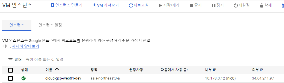 Created [https://www.googleapis.com/compute/v1/projects/secret-zyr-341/zones/asia-northeast3-a/instances/cloud-gcp-web01-dev].