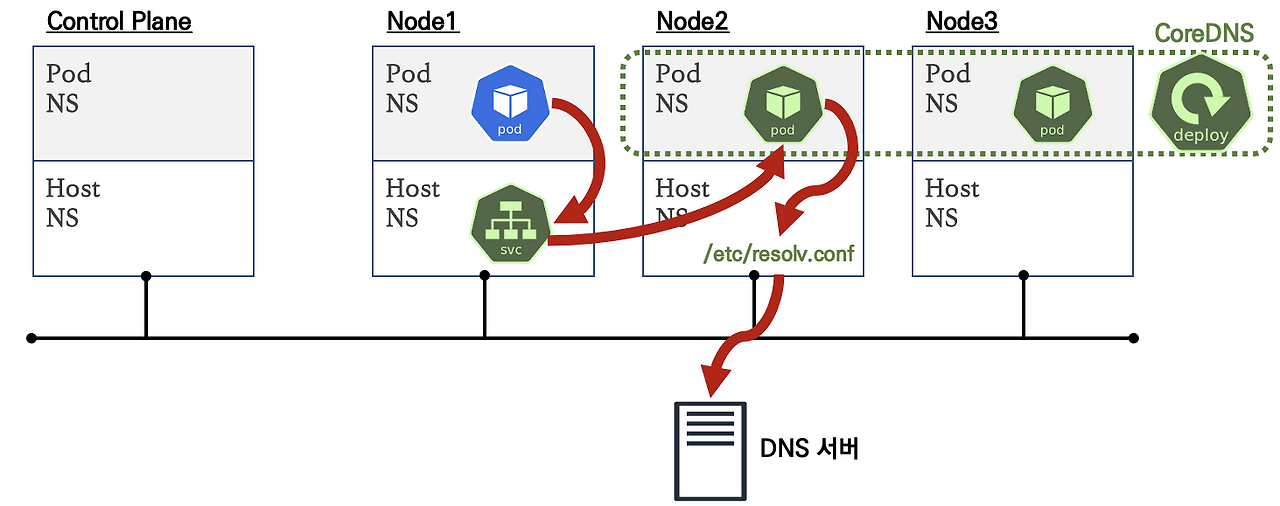 pod는 coredns에 질의를 보내고 응답받음.