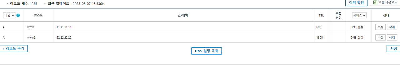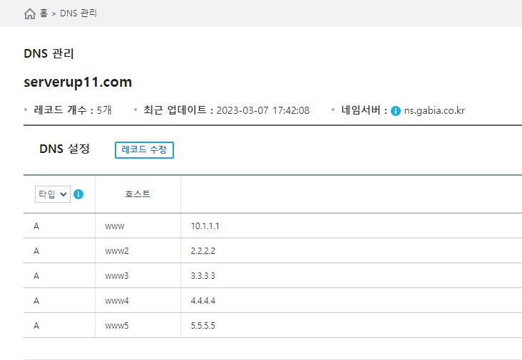 도메인 정보 변경 > DNS관리 > 설정 > 레코드 수정 > 레코드 추가