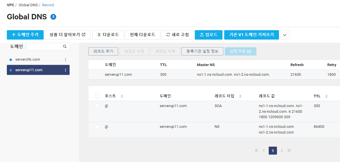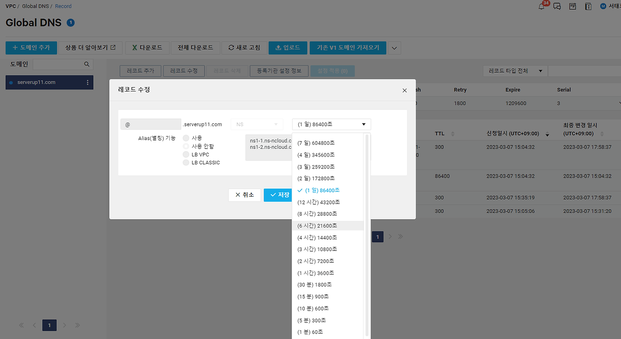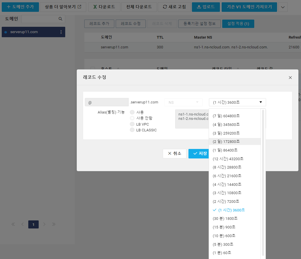 최소 1일 전에 네이버 클라우드 Global DNS에 설정된 도메인의 NS TTL을 3600초(1시간)로 줄여 놓는다.