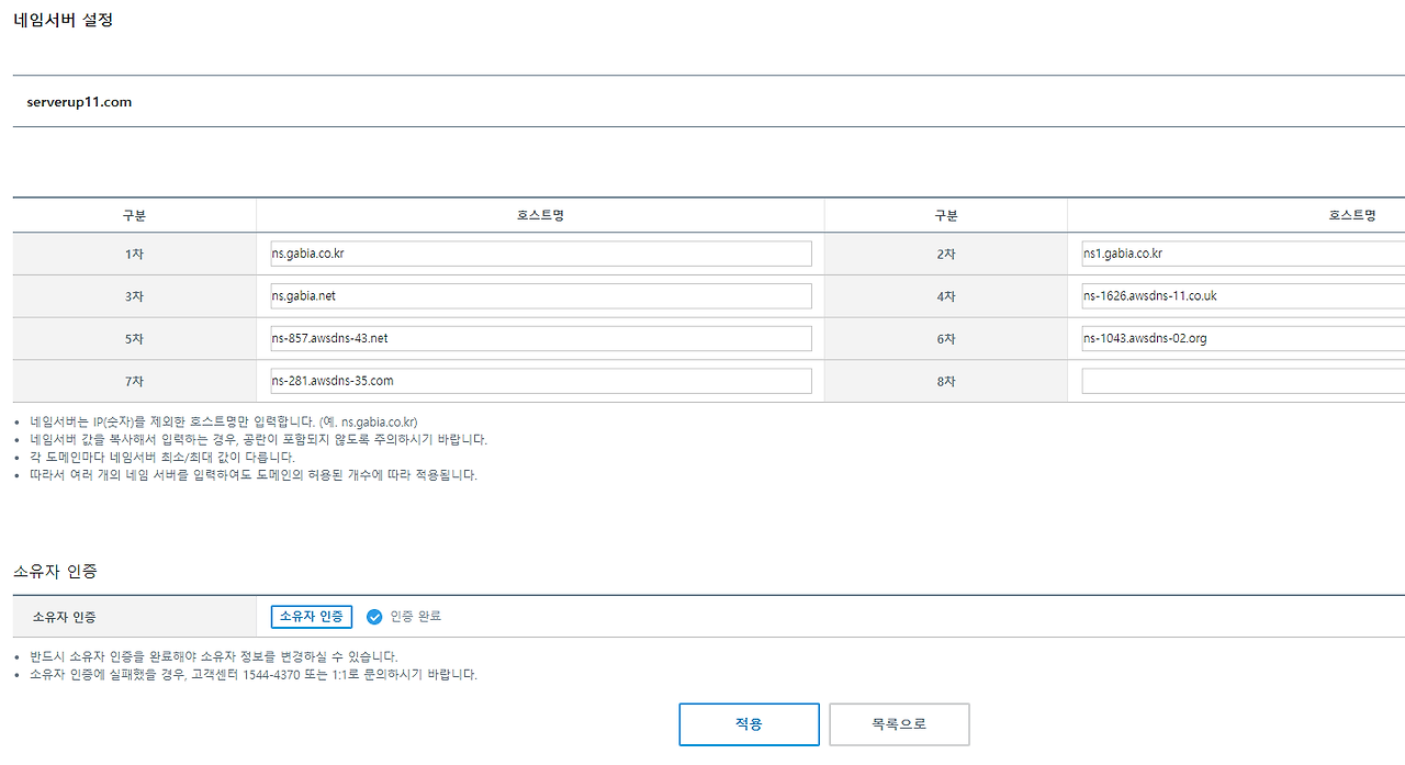 도메인 등록 대행기관에서 네임서버를 아래로 변경
