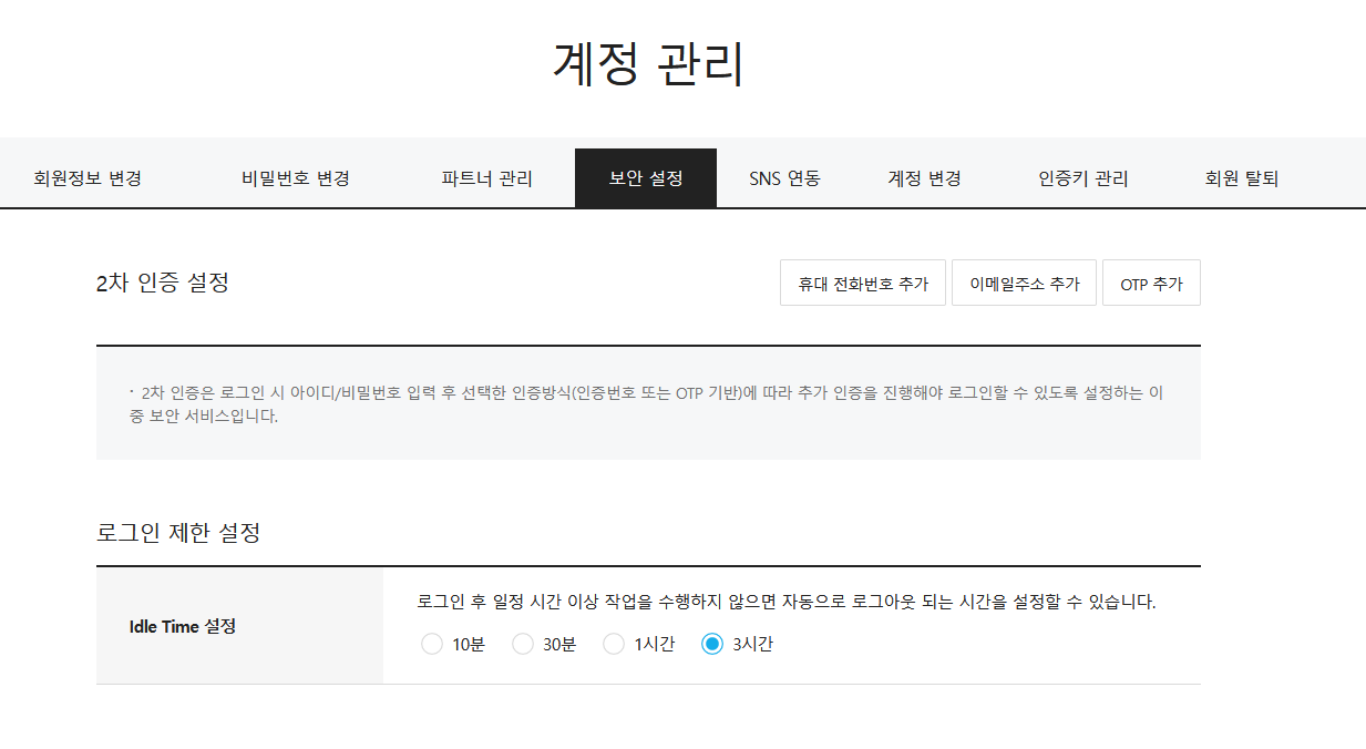 마이페이지 > 계정관리 > 보안설정에서 2단계 인증을 설정한다.