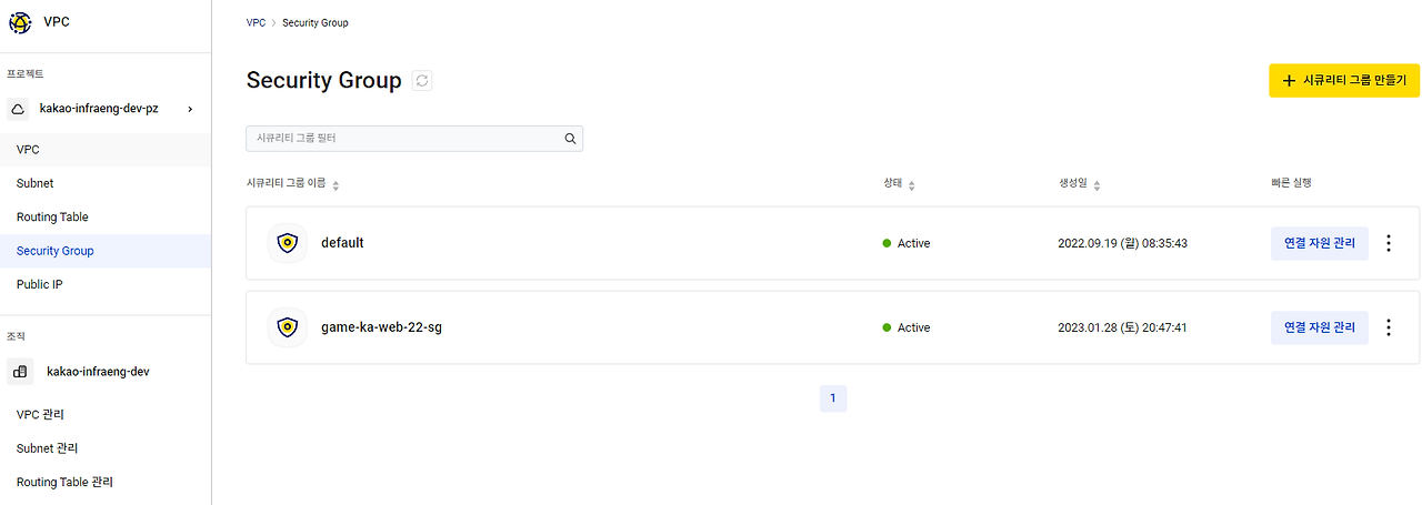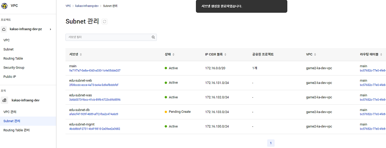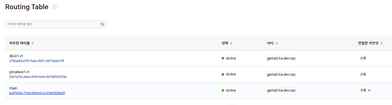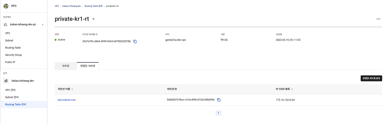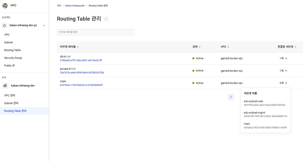 연결된 서브넷 변경은 왼쪽 조직 > Routing Table 관리 메뉴에서 가능하다.