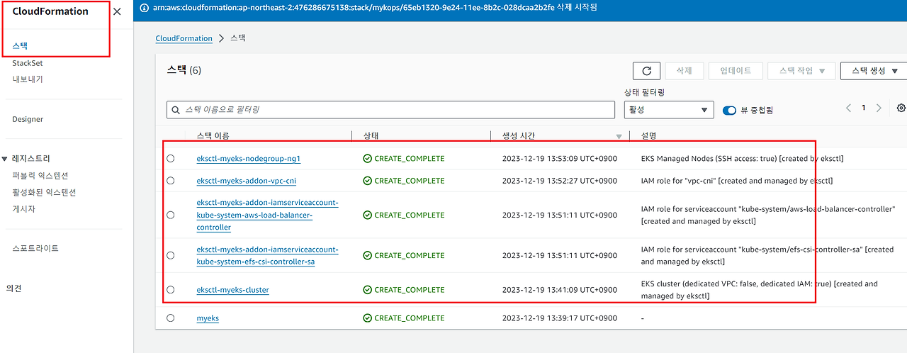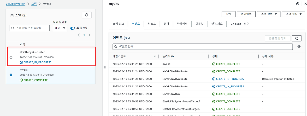 cloudformation에서 바로 cluster가 설치되는게 보여야함.