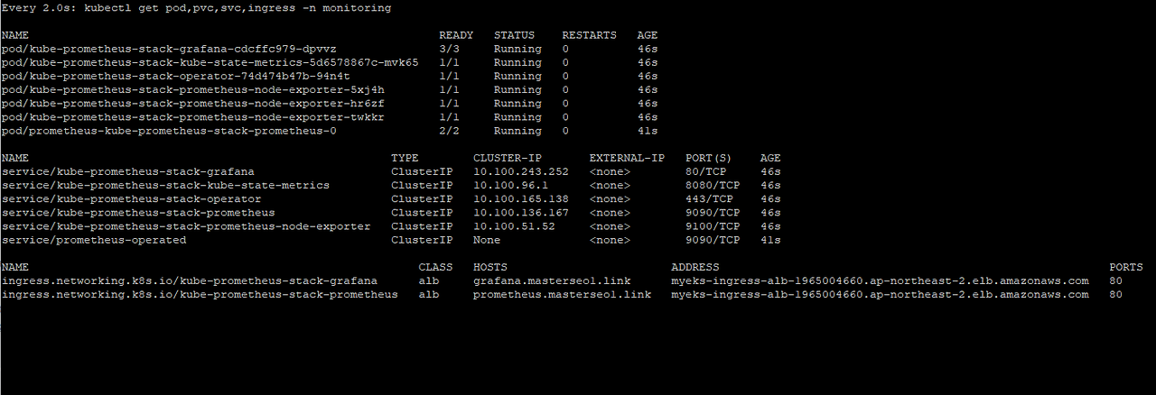 watch kubectl get pod,pvc,svc,ingress -n monitoring