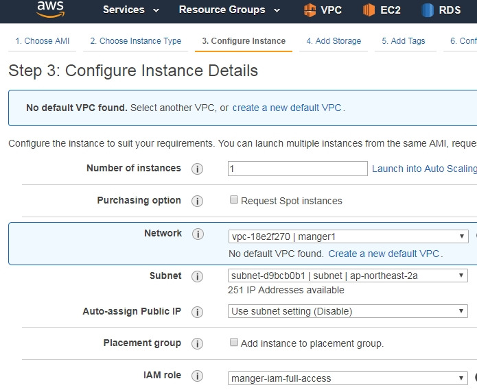 3) EC2 서버를 만들때, IAM에서 만든 IAM Role인 EC2 FULL ACCESS 를 사용하도록 선택한다.