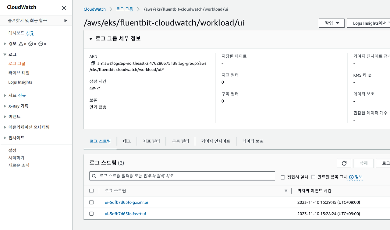 aws-for-fluent-bit pod 설치하면 cloudwatch log에 가면 로그 쌓인것을 볼수 있다.