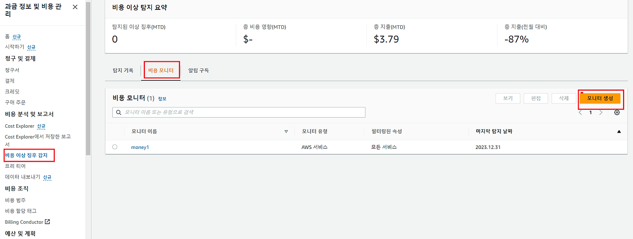 비용 이상 징후 감지 > 비용 모니터 > 모니터 생성에서 생성하여 사용한다.