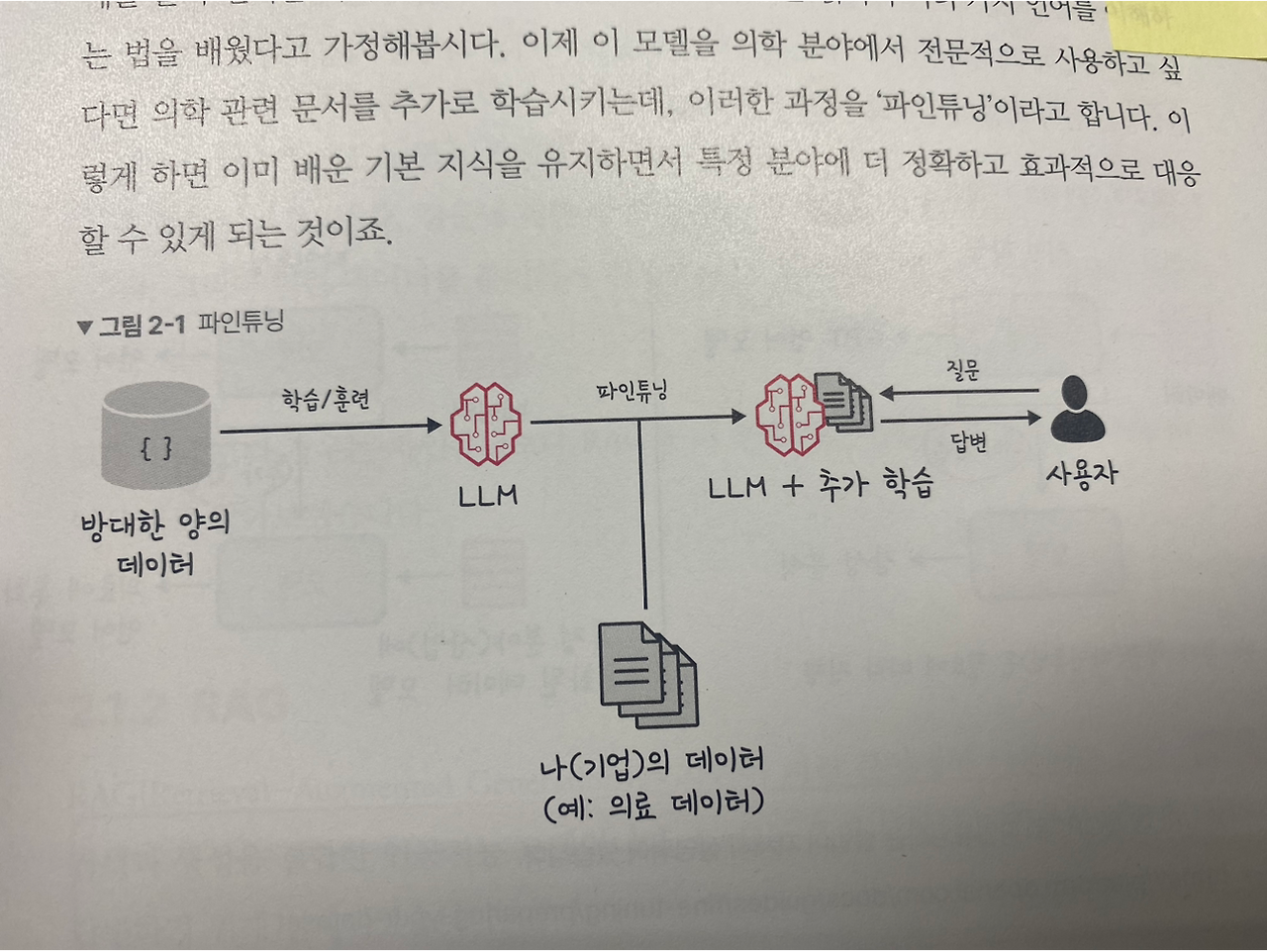 이 모델을 의학 분야에서 전문적으로 사용하고 싶다면 의학 관련 문서를 추가로 학습시키는데, 이러한 과정을 파인튜닝이라고 한다.