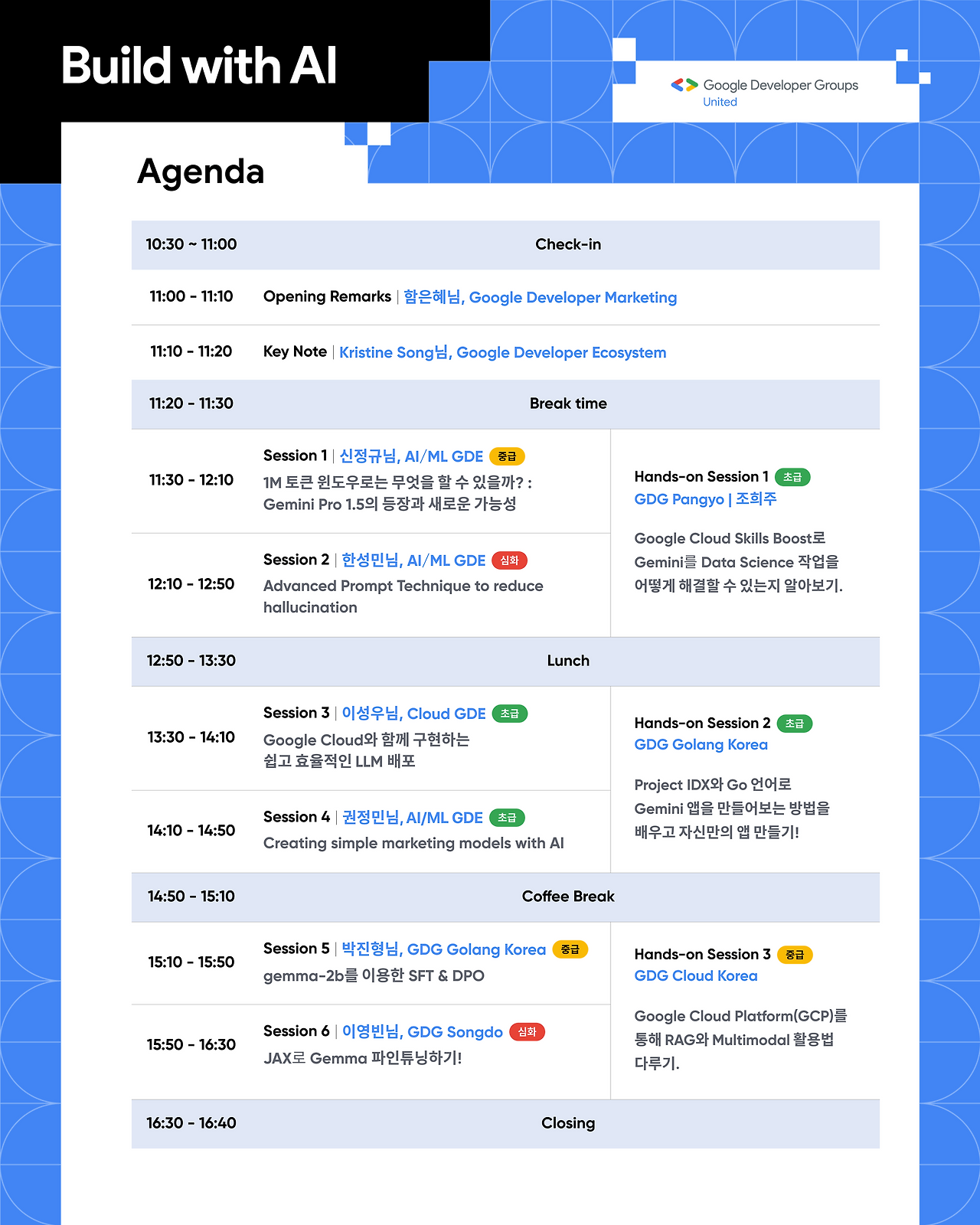 최신 Google Technology를 직접 경험하고 체험할 수 있는 기회를 제공할 계획이며, Technical Talk 및 Hands-on 세션 등이 진행될 예정입니다.