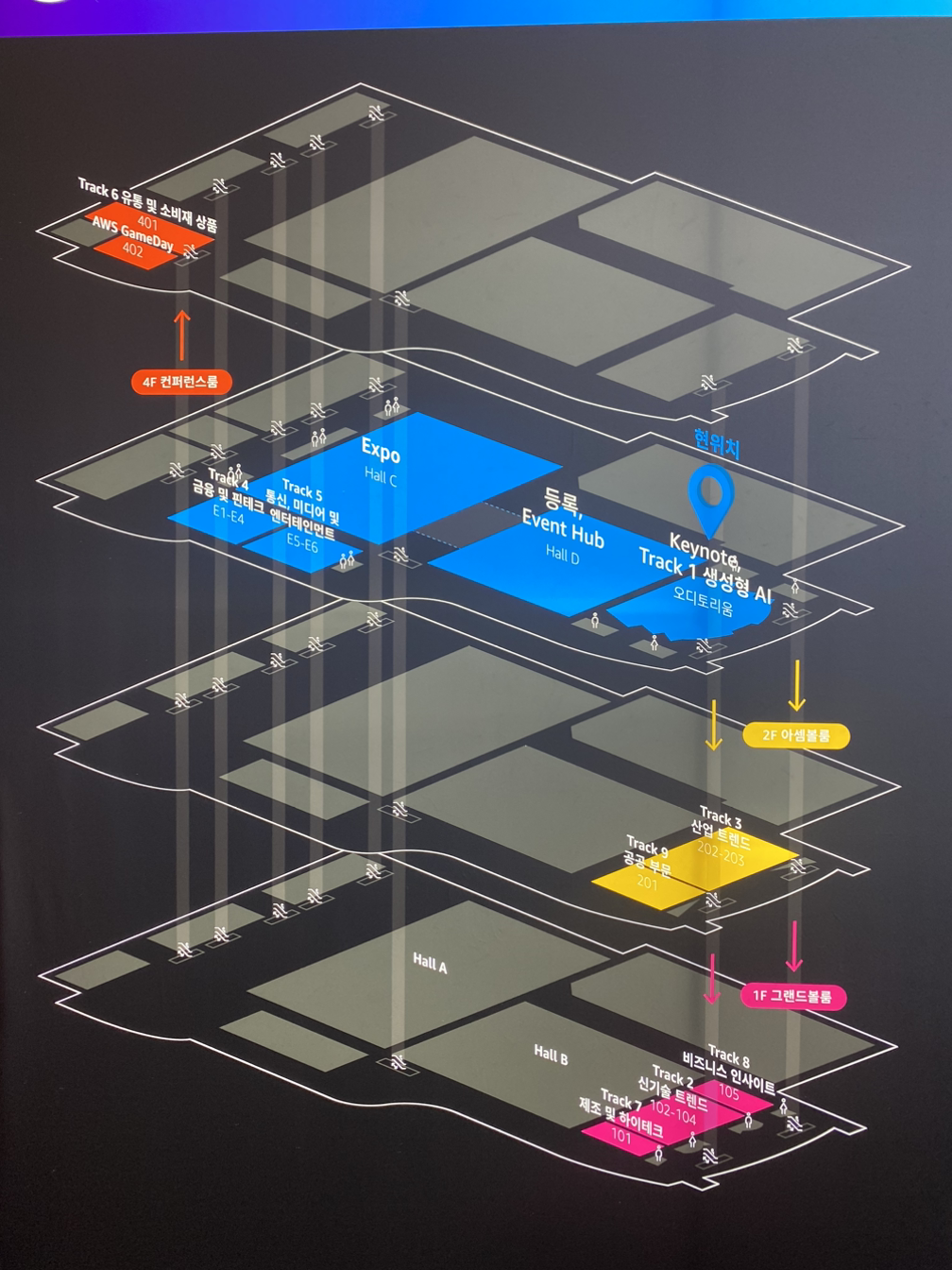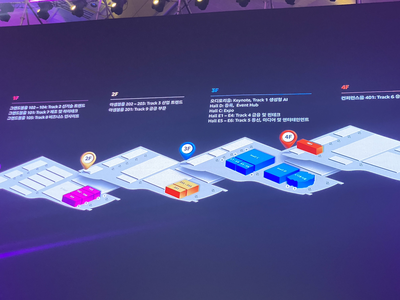 참여 기업들 보시고 솔루션 찾으시기 바랍니다 참여부스는 D홀로 입장해서 C홀로 가시면 됩니다. 전체부스 지도. 가운데 AWS. 양쪽 끝으로 참여기업. 들어가자마자 왼편. 1 현대부터 2 3 4 5 6 7 8 9 10