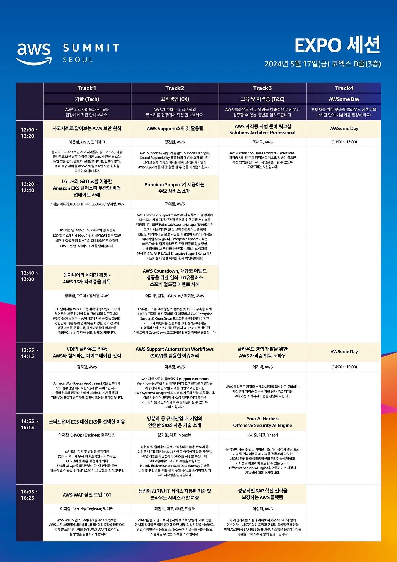 AWS 서밋 2024 | AWS 서밋 내용중 AI, K8S , 기타 AWS 자료로 구분해 정리했습니다. <1> AI <2> K8S <3> 기타 AWS 사례 <1> AI 1 https://brunch.co.kr/@topasvga/4085 <2> K8S 1 https://brunch.co.kr/@topasvga/4080 2 https://brunch.co.