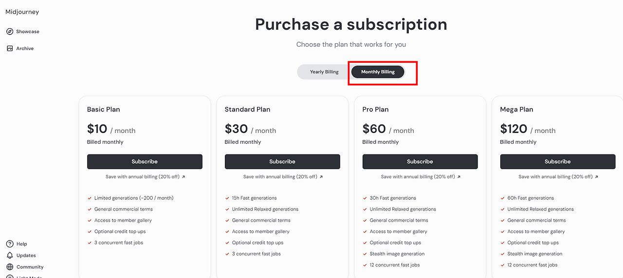 미드저니는 기본 연단위 과금이 디폴트로 되어 있다.
