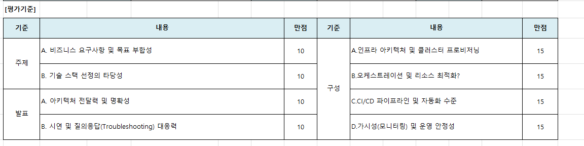 컨테이너 인프라 구축 프로젝트를 평가하기 위한 기준을 요청하신 세 가지 영역(주제, 발표, 구성)과 항목 수에 맞추어 정리해 드립니다.