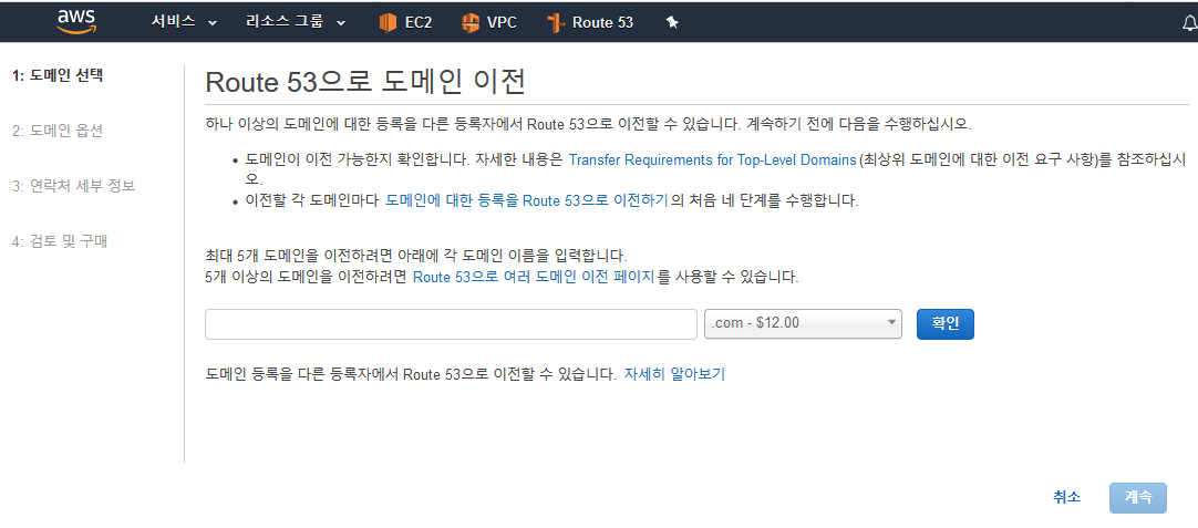 2) AWS ROUTE53에서 도메인 이전을 클릭