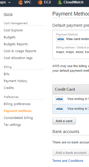 내계정 클릭 > 빌링 대시보드 클릭 > 지불방법 (Payment methods)에서