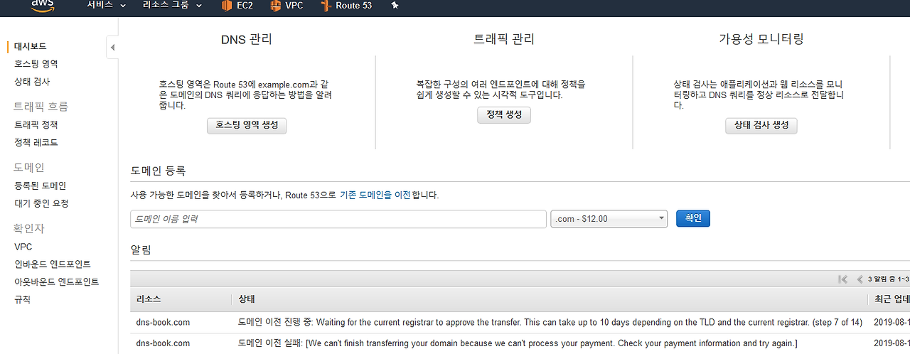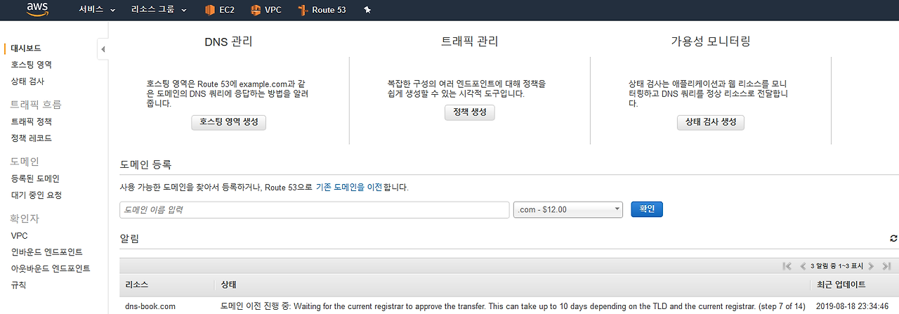 도메인 등록 대행기관에서 관리하던 도메인을 AWS ROUTE53으로 이전하고자 한다.